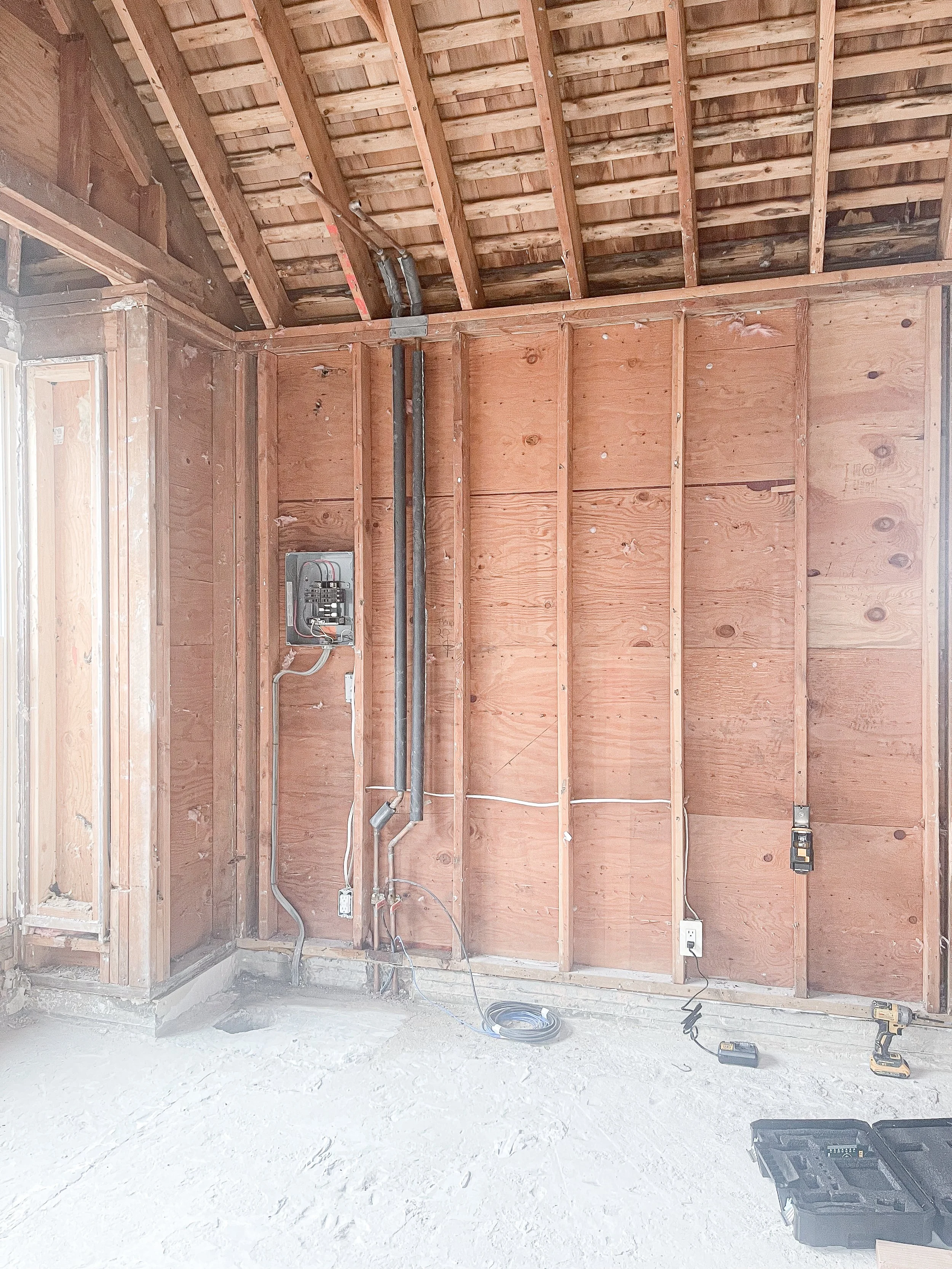 The main living room space will be drywalled, painted white, including the vaulted ceiling. They’ll be HVAC, fan and lighting added - all on dimmers.